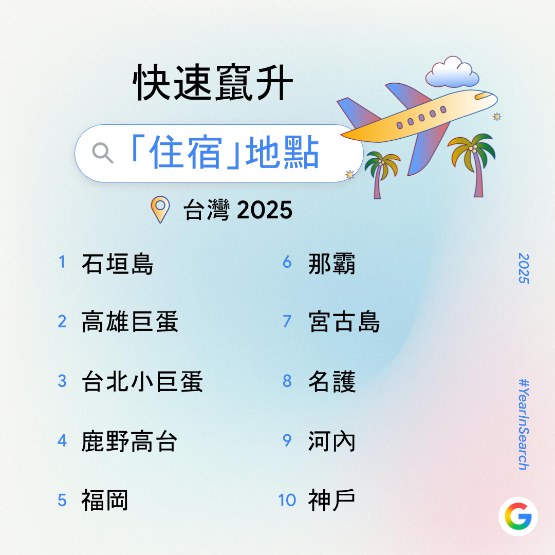 從旅遊榜單可窺見2025年的旅遊趨勢:日本的「石垣島」、「福岡」與「那霸」快速竄升,同時也印證了台灣的演唱會經濟不容小覷,「高雄巨蛋住宿」與「台北小巨蛋附近住宿」都成為熱搜關鍵字,證明搜尋不只是資訊的終點,更是通往真實體驗的起點。