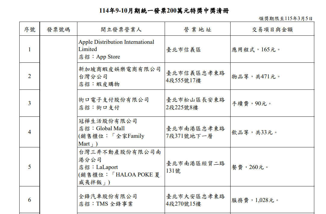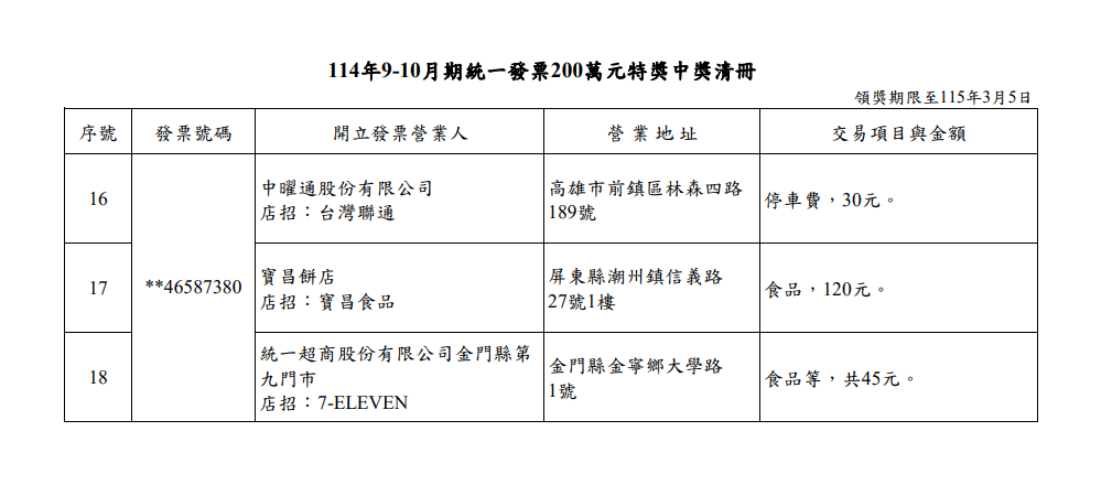 114年9-10月期統一發票200萬元特獎中獎清冊。財政部提供