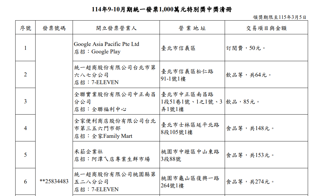 114年9-10月期統一發票1,000萬元特別獎中獎清冊。財政部提供