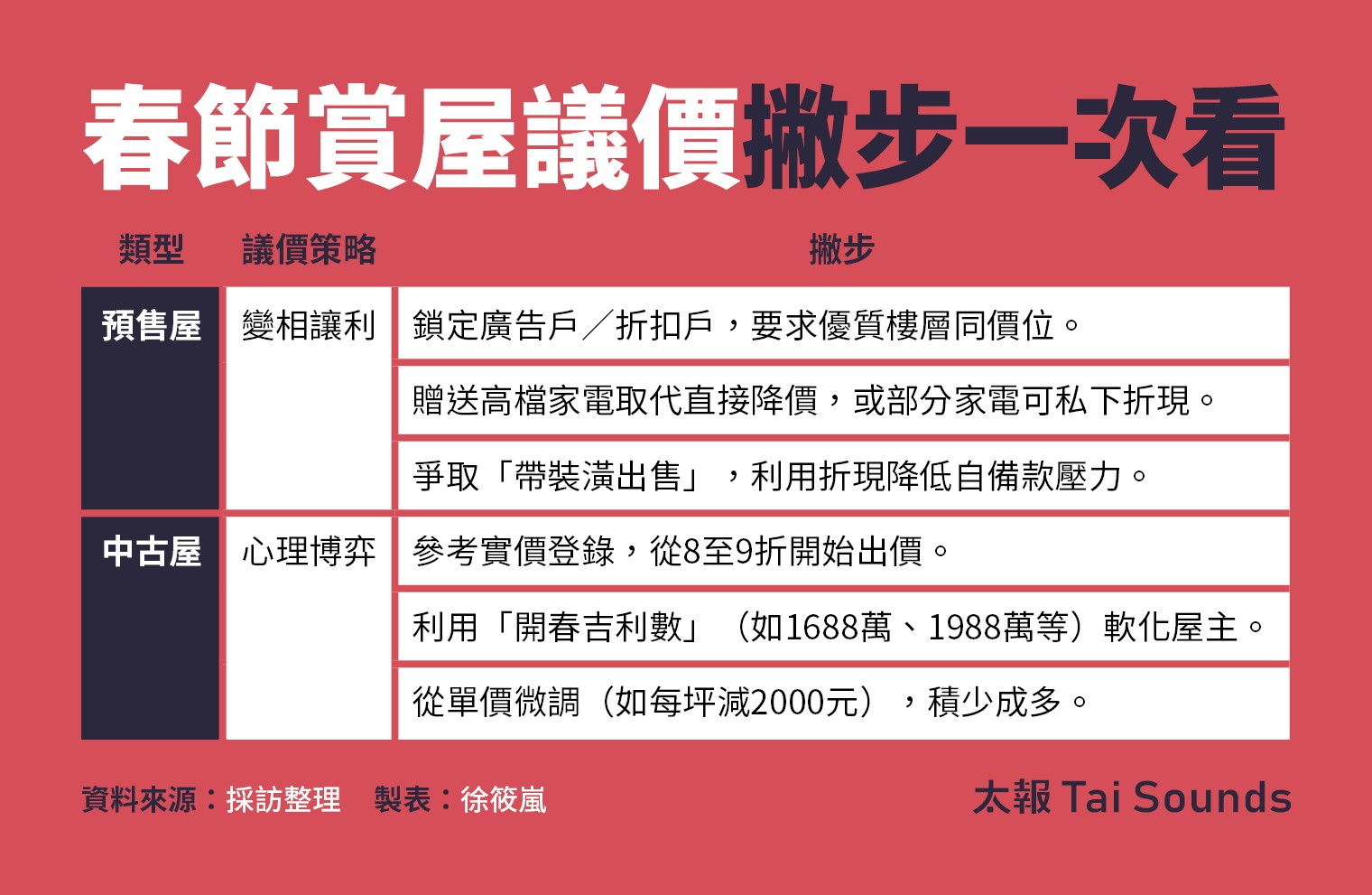 中古屋砍價有學問 善用「吉利數」與陪同策略春節賞屋議價撇步一次看。太報製表