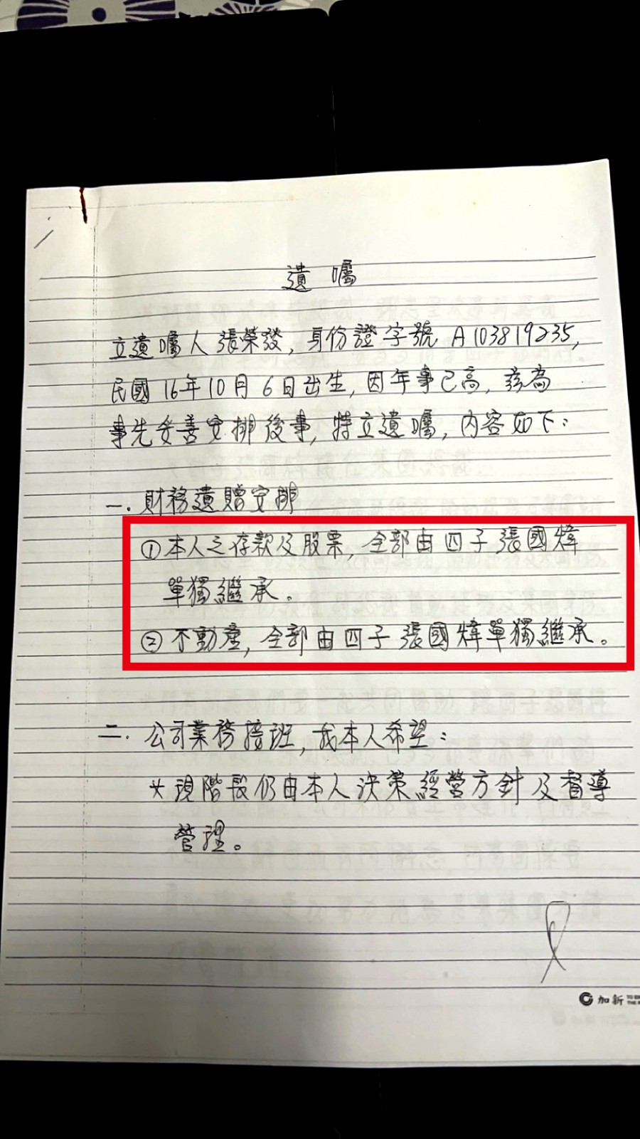 張榮發留下的遺囑指定遺產全部由張國煒繼承。翻攝網路