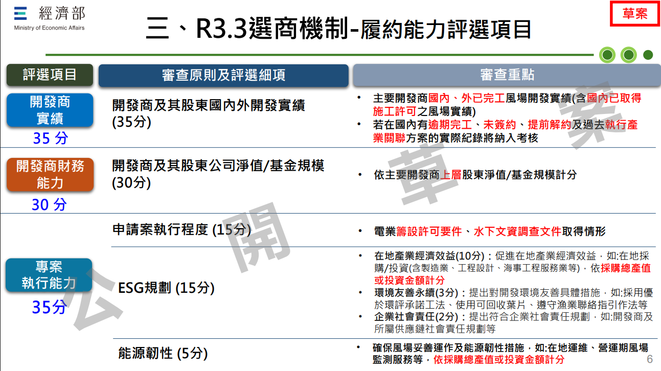 離岸風電3-3選商機制計分草案。截自能源署簡報