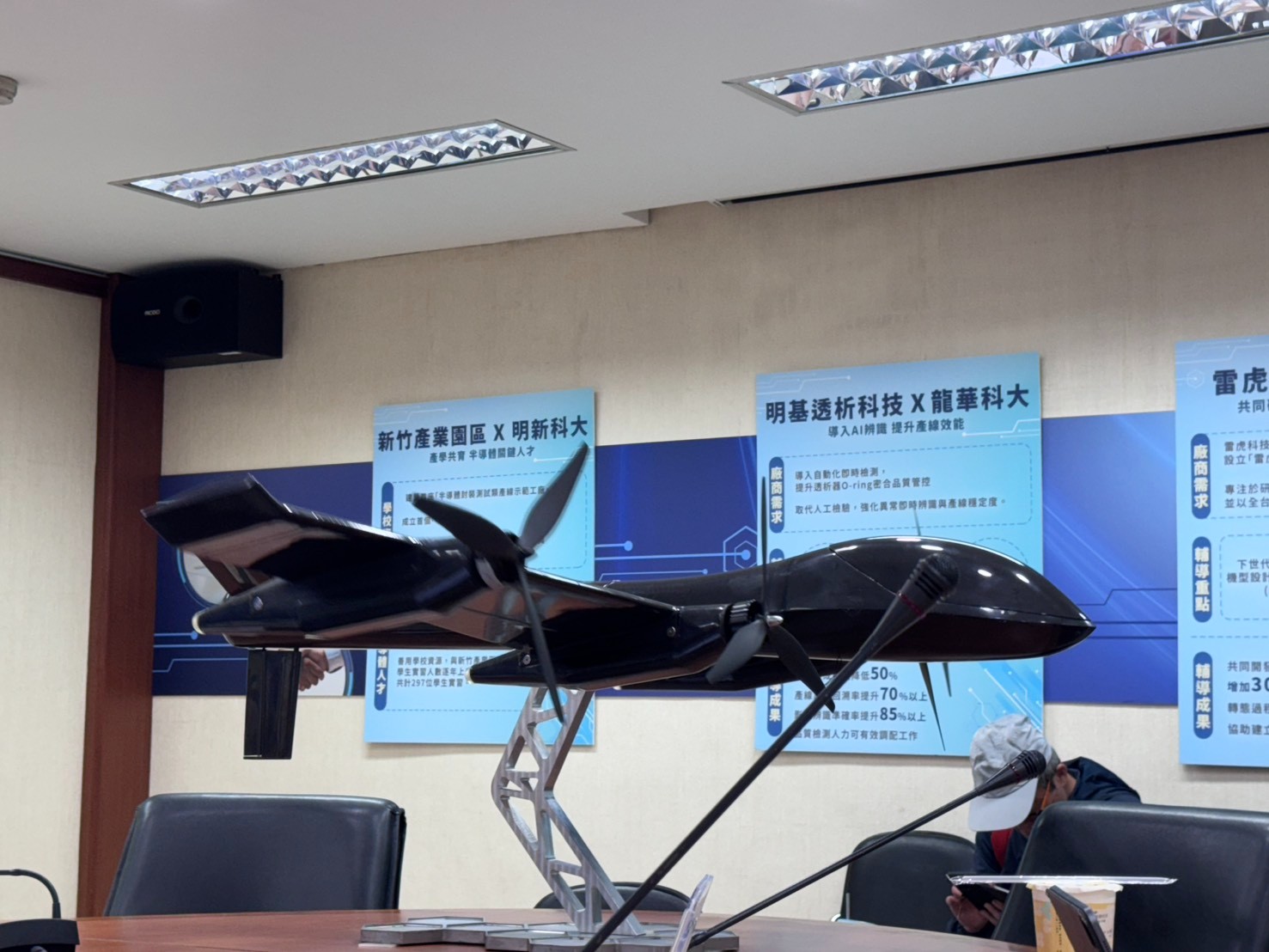 虎尾科大副校長陳大正則介紹,與雷虎科技共同成立聯合研發中心,首座以無人機為主軸的聯合研發中心,並成功自主研製TF500定翼無人機,是能垂直起降的無人機,輕量化也使續航力提升約30%,可應用於長距離偵察任務,建立國防自主量能。