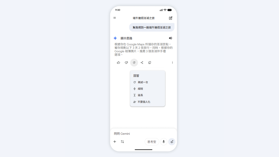 使用者規劃端午連假前往澎湖旅遊時,只需詢問 Gemini,它會為使用者生成完整行程與個人化推薦。業者提供