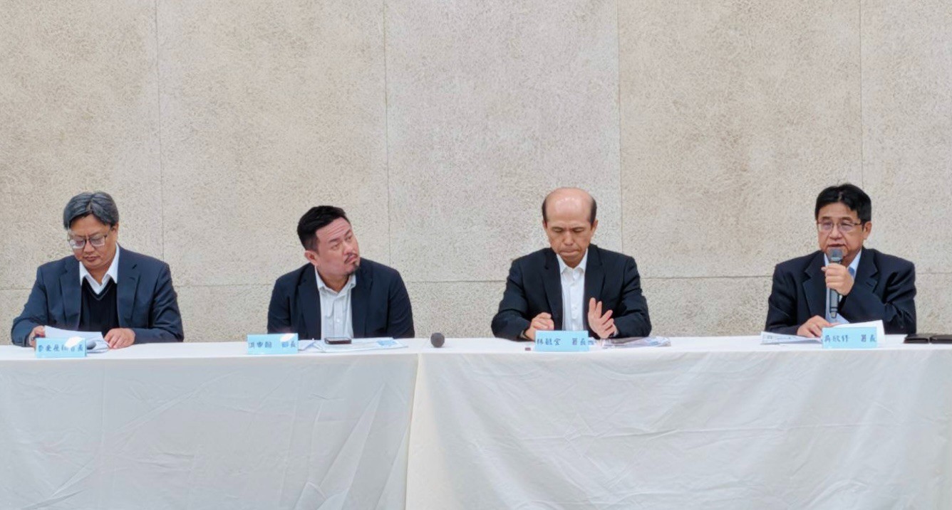勞動部長洪申翰(左2起)、職安署長林毓堂、內政部國土署長吳欣修在記者會上說明未來共同合作強化源頭減災及人員訓練。內政部提供