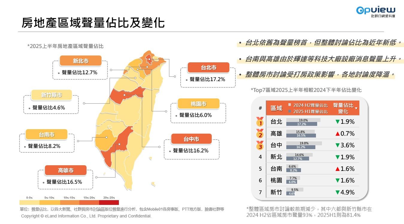 在區域聲量分布上,意藍資訊表示,六都與新竹縣市仍是全台房市討論主力,合計占比達81.4%,各縣市聲量占比排名依序為台北市、高雄市、台中市、新北市、台南市、桃園市、新竹縣市。