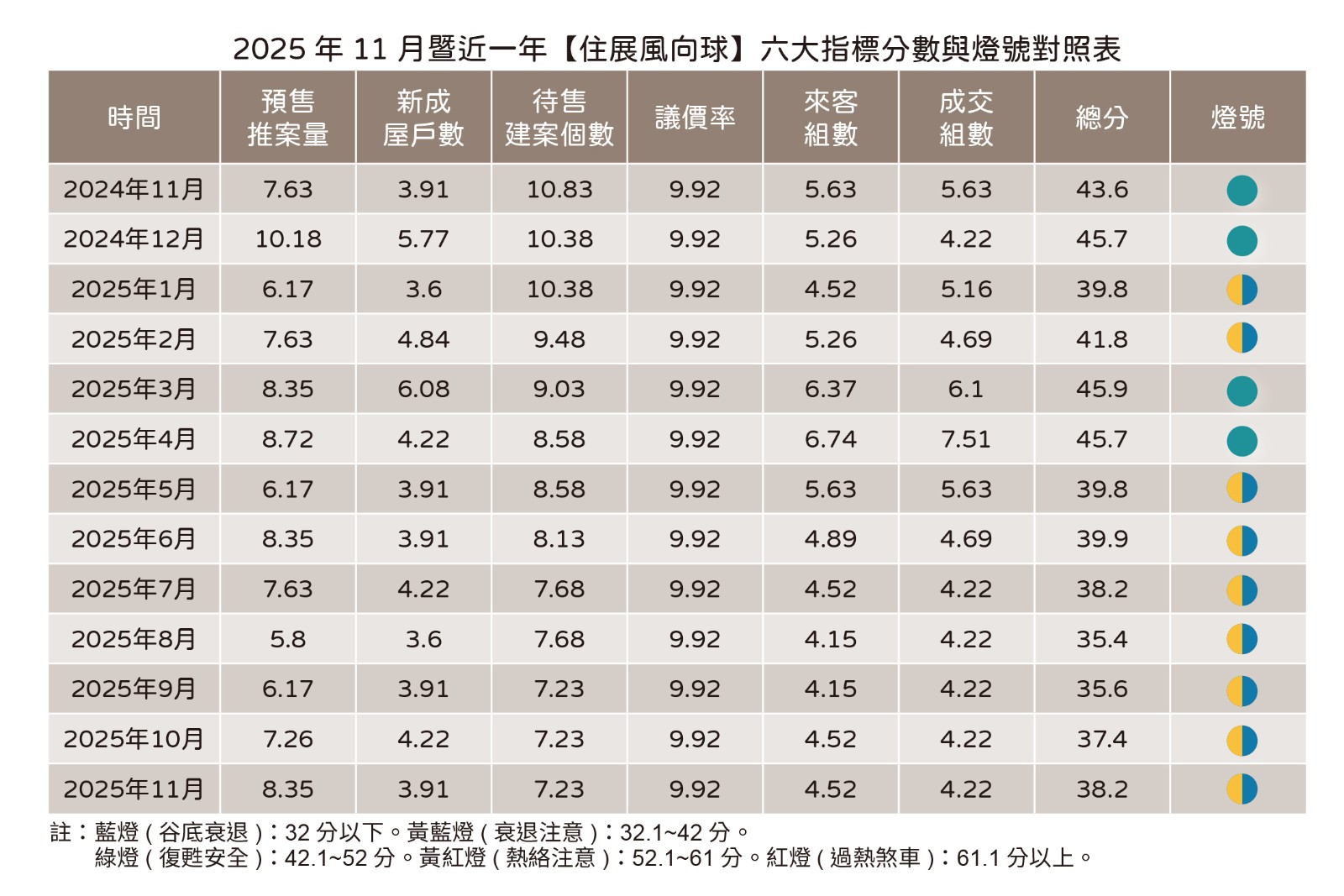儘管時值年底,建商推案腳步明顯加速,但代表北台灣新建案市場概況的「住展風向球」,11月受到年底預售大案進場推升供給,分數進步至38.2分,不過買氣並未同步響應,燈號仍維持衰退的黃藍燈。追蹤指標建案的平均來客組數與成交組數持續冷清,顯示部分品牌大案危機入市的同時,多數案場仍面臨交投清淡的困境,後續房市賣壓值得持續關注。