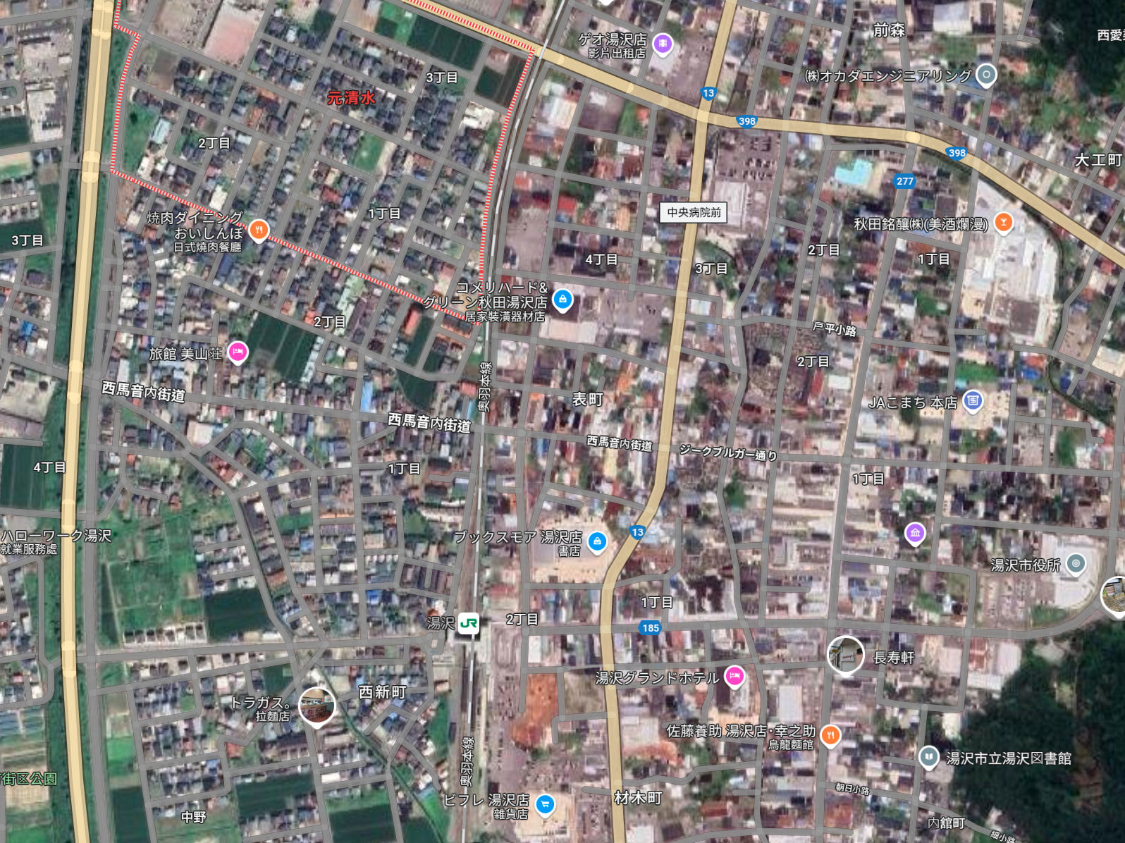 熊攻擊事件深處鬧區,居民不敢相信是真的日本秋田縣湯澤市有黑熊連續攻擊四人的區域,從空照圖可見是人口密集的繁華鬧區,緊靠著高速公路與火車站。翻攝Google地圖