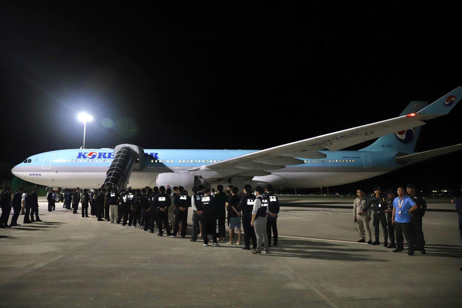 2025年10月18日,南韓警方在柬埔寨干丹省將64名涉參與柬埔寨園區犯罪的韓籍犯嫌押送回國。路透社
