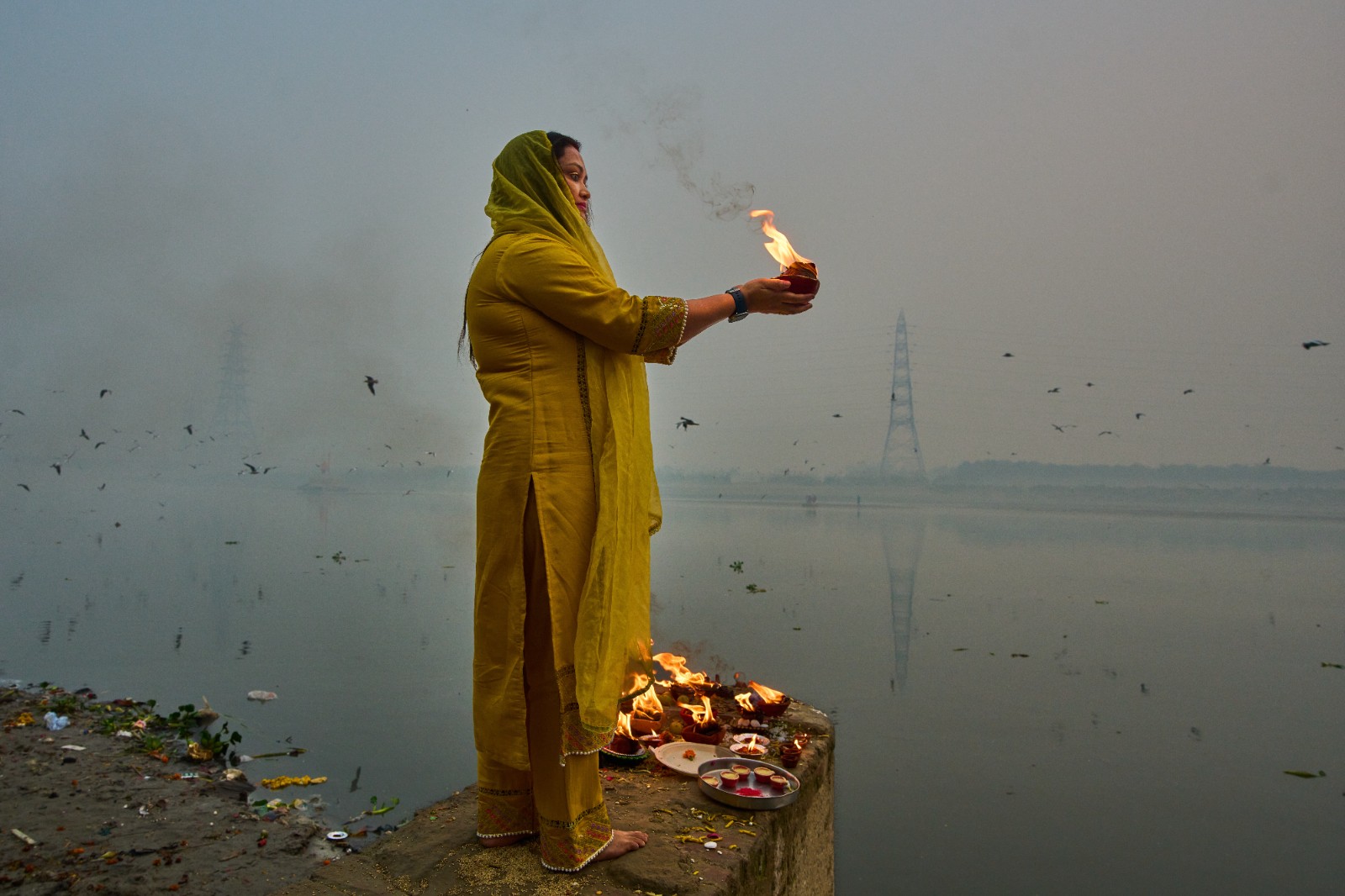 2025年11月2日,印度新德里亞穆納河(River Yamuna)河畔,一位印度婦女進行晨間祈禱。美聯社