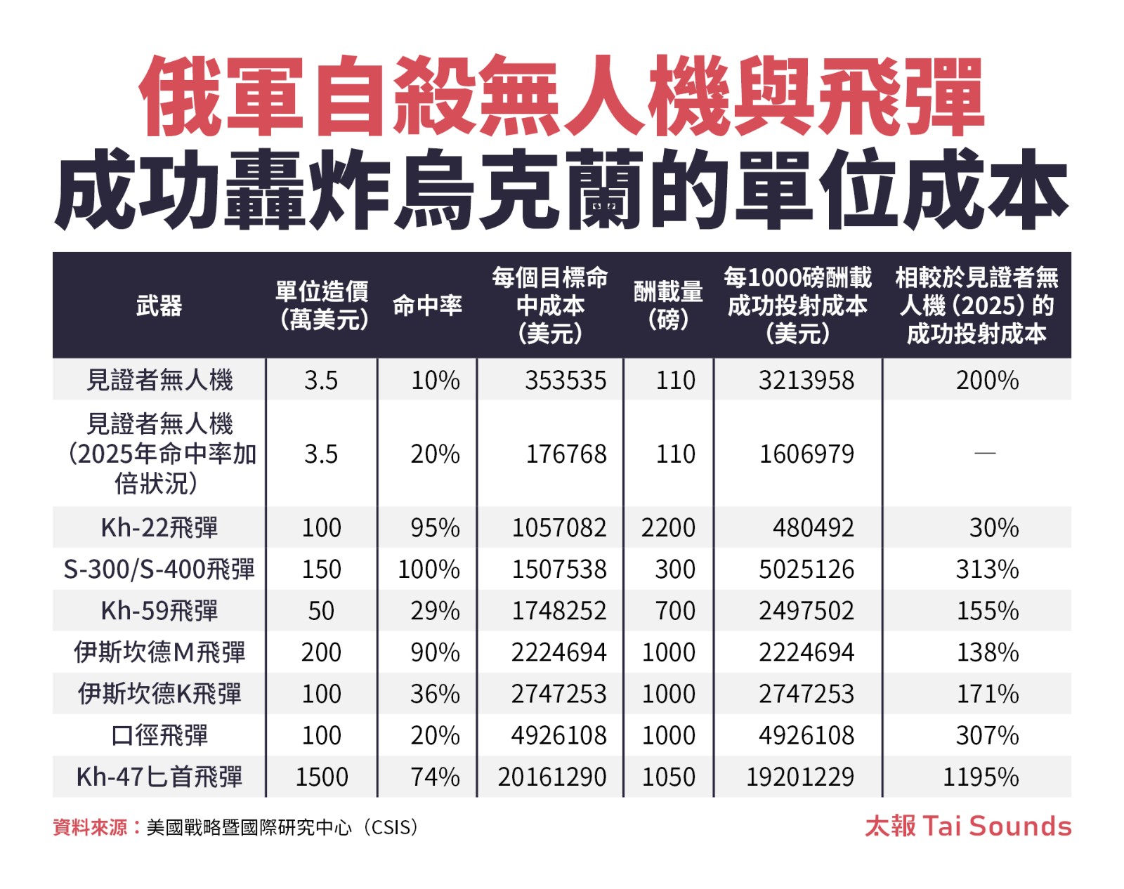 表:俄軍無人機與飛彈成功投射轟炸烏克蘭的單位成本