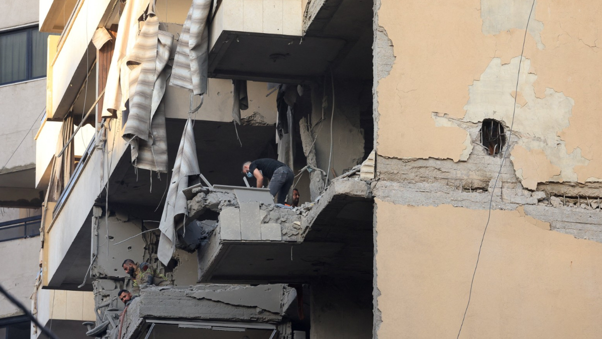黎巴嫩貝魯特一間公寓11月23日遭以色列轟炸攻擊,人員在被炸垮的陽台處檢視狀況。路透社