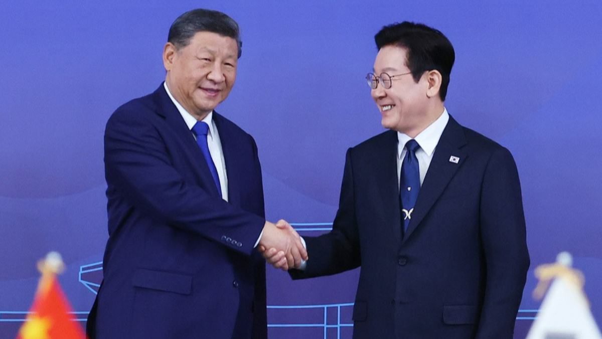 2025年11月1日,中國國家主席習近平(左)與南韓總統李在明,於南韓慶州舉行雙邊會談。美聯社