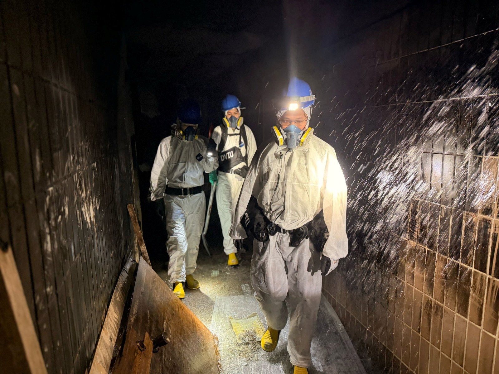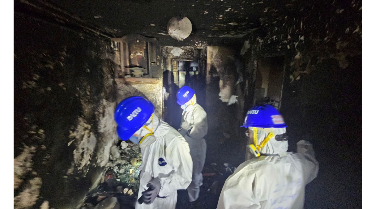 香港警方週日(11/30)晚間在臉書公布數張宏福苑內部照片。頭戴藍色頭盔、防護面罩的災難遇害者辨認組人員靠著頭燈和手電筒在室內工作,只見旁邊的牆壁和頭頂天花板及腳底下的地板全被燒得一片焦黑。