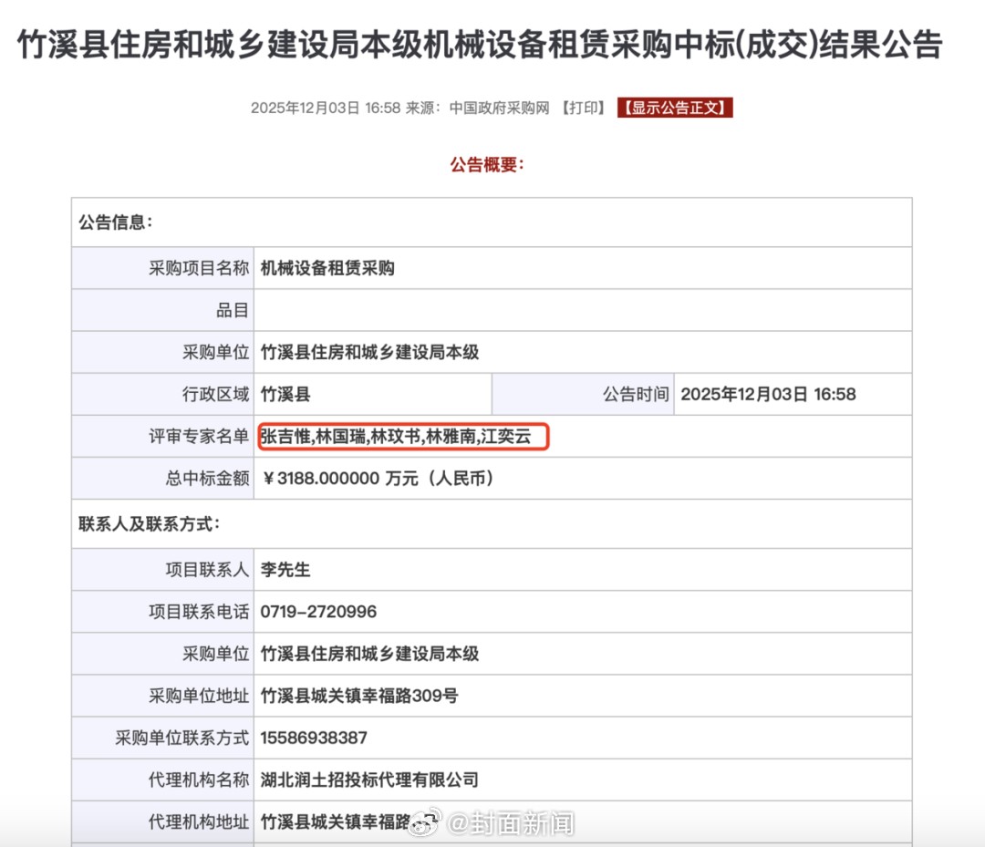 《瀟湘晨報》、《紅星新聞》等媒體報導,中國網友週三(12/3)發現,當天公布於中國政府採購網的湖北《竹溪縣住房和城鄉建設局》採購得標公告評審小組成員名單中,「張吉惟、林國瑞、林玟書、林雅南、江奕雲」這五個名字,其實出自百度文庫《10000中國普通人名大全》。