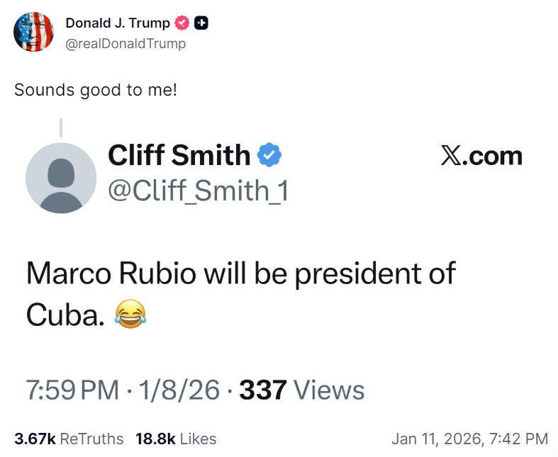 2026年1月11日,美國總統川普在Truth Social平台回應網友貼文,稱盧比歐當古巴總統「聽起來不錯」。取自Truth Social平台