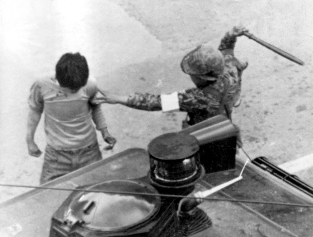 1980年5月20日,南韓「光州民主化運動」中軍警武力鎮壓示威,圖為軍人毆打一名被捕的示威者。美聯社資料照