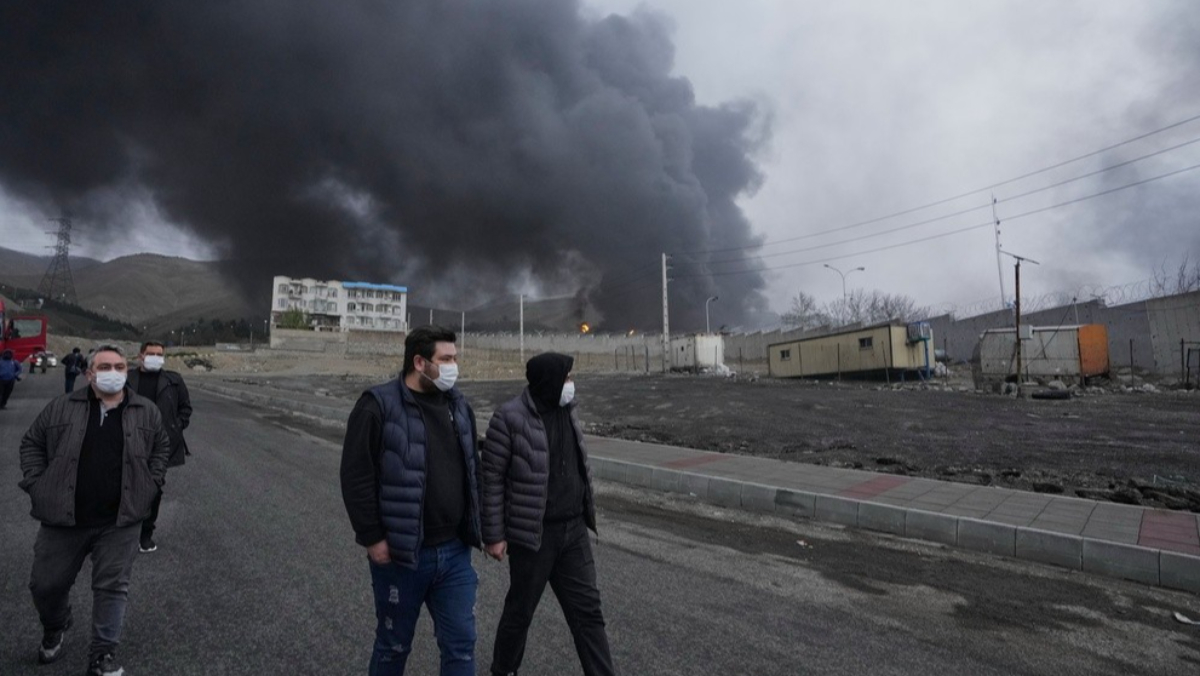 2026年3月8日,伊朗首都德黑蘭的一座儲油槽遭美國和以色列攻擊,冒出大量濃煙,路過民眾都戴著口罩。美聯社