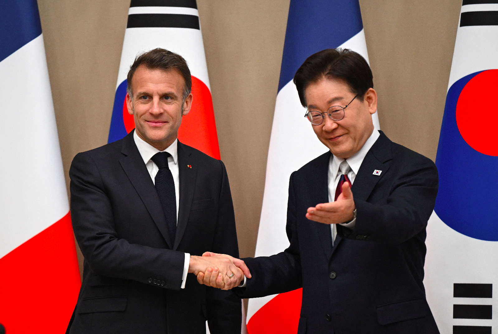 2026年4月3日,法國總統馬克宏(左起)與南韓總統李在明在首爾青瓦台會晤時握手。路透社