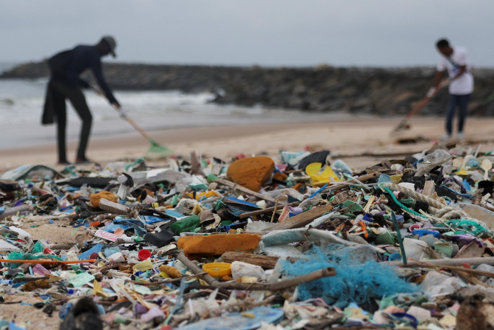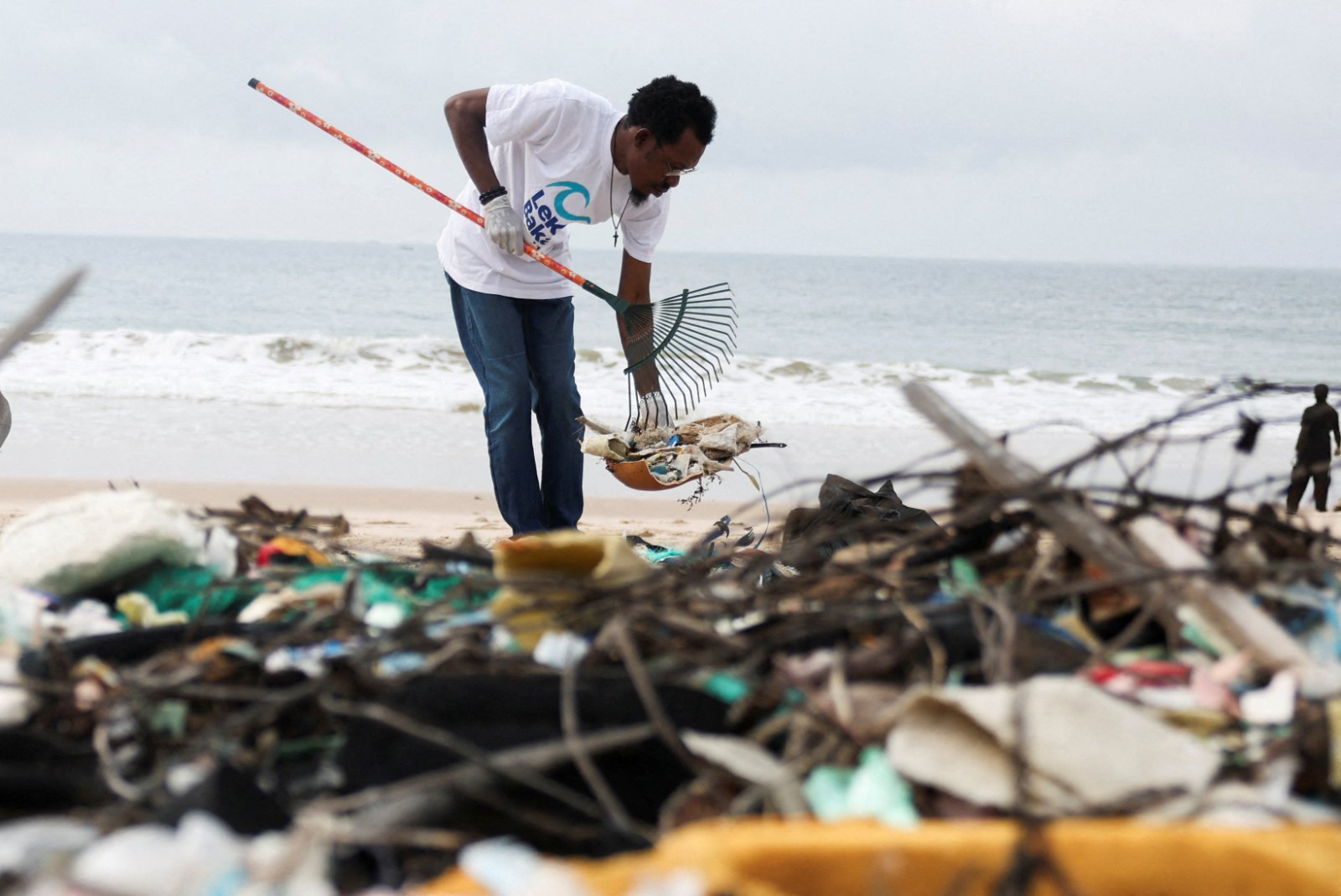 2025年9月20日,奈及利亞海龜保育志工在沙灘清垃圾。路透社