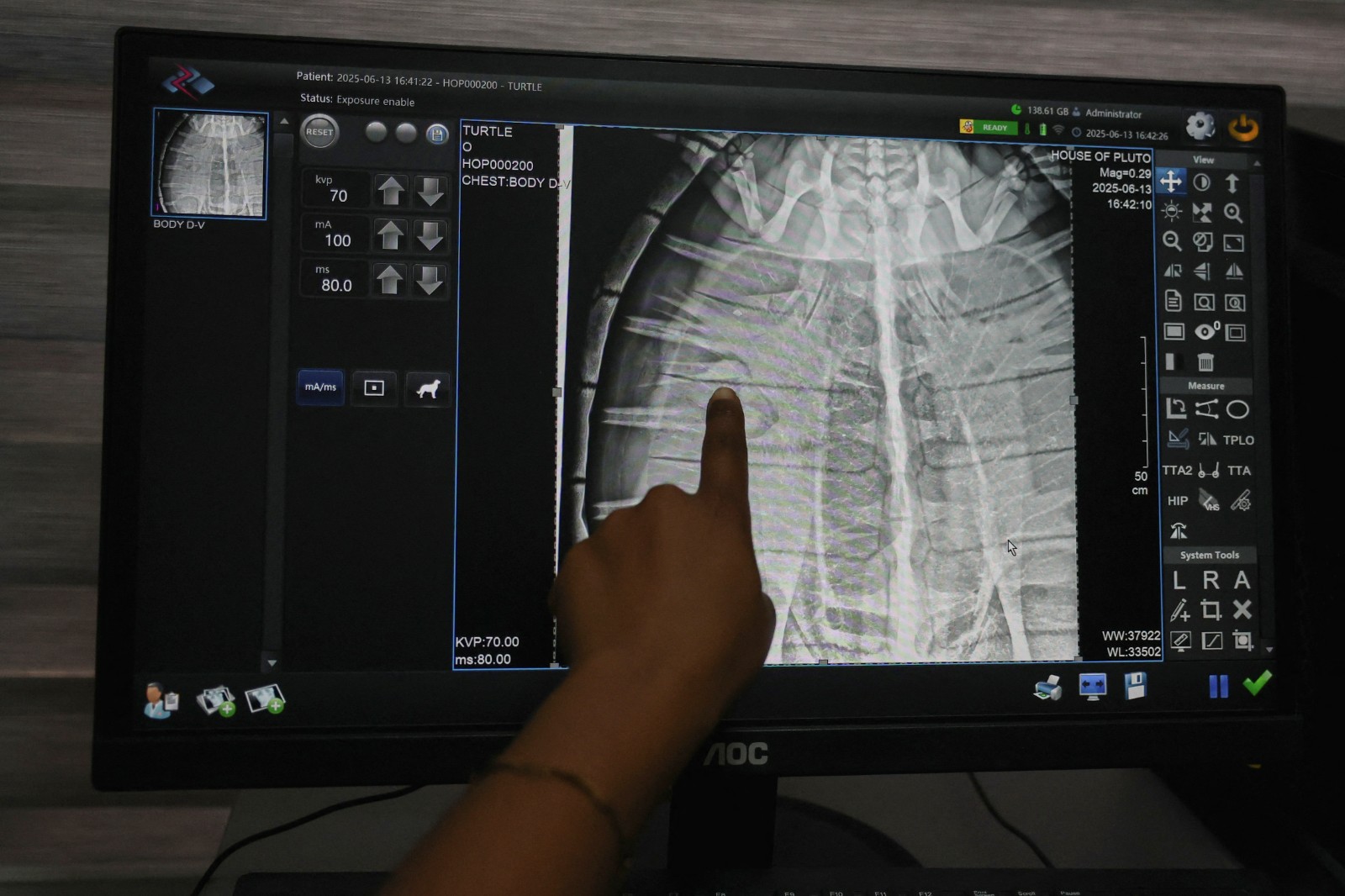 2025年9月20日,奈及利亞一名獸醫查看被救援海龜的X光片。路透社