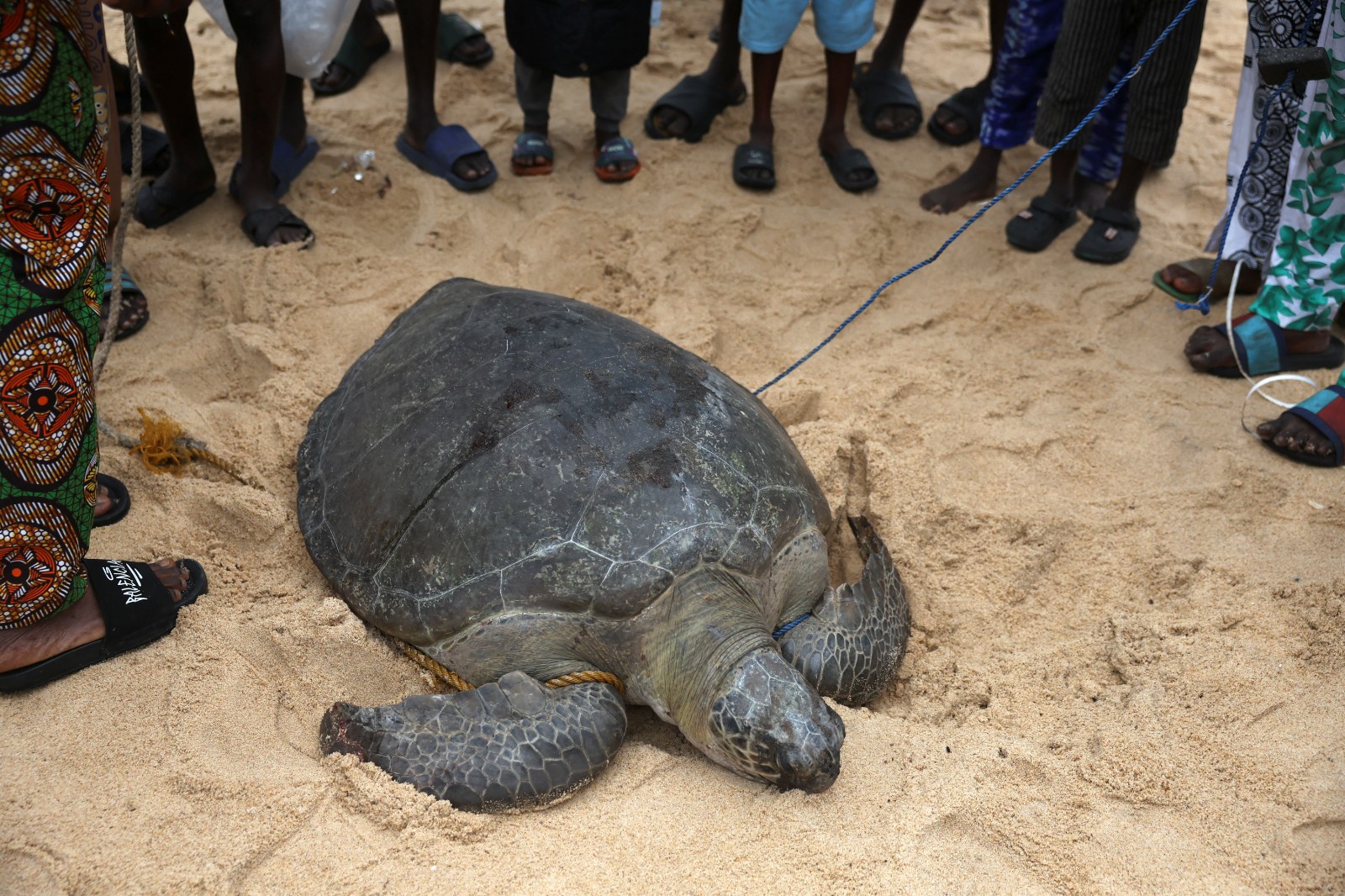 奈及利亞漁夫圍著一隻捕來的海龜。路透社