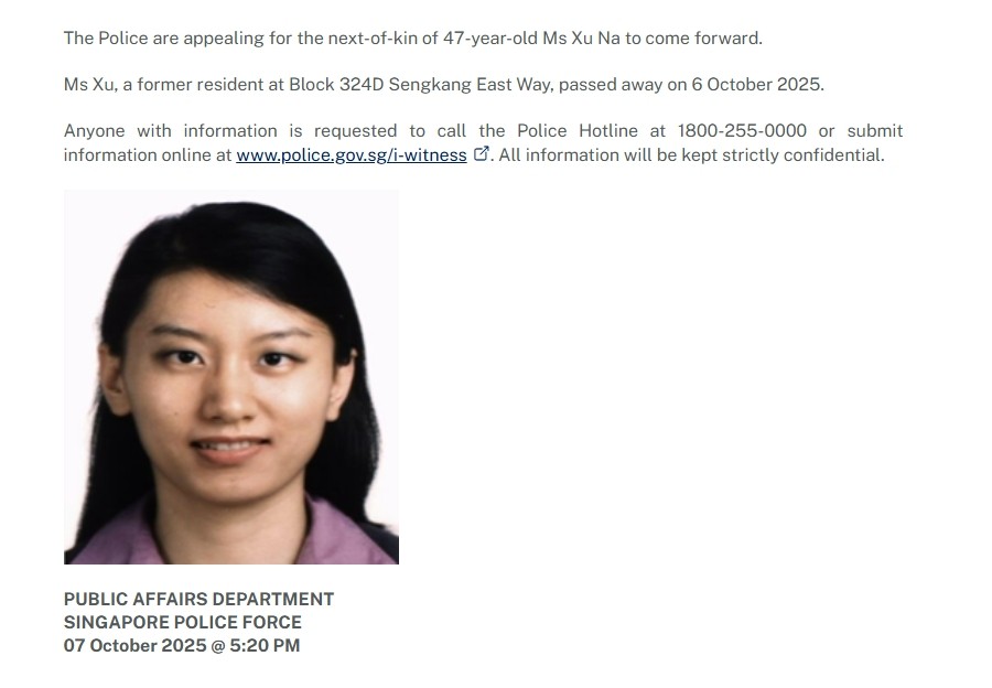 新加坡盛港雙屍案的女死者徐娜。翻攝新加坡警察部隊(SPF)官網