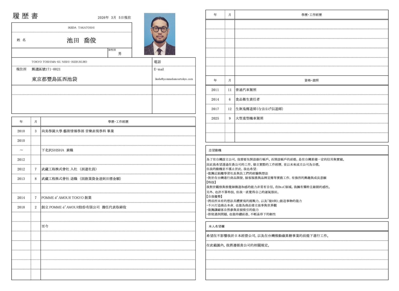 日本蘋果糖名店老闆池田喬俊在X平台曬出履歷表,表示自己將在台灣求職,目標是順利開戶,然後成立公司。翻攝X平台