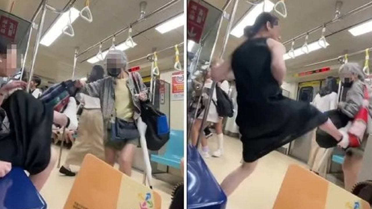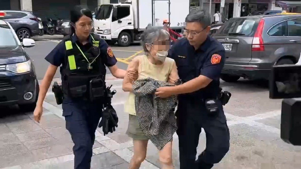 捷運「甩包嬤」(取自Threads)遭飛踹,她因為竊盜通緝1日落網,被員警帶回警分局偵訊。讀者提供