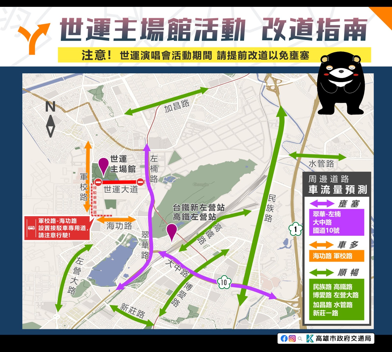 交通局預估活動期間,左楠路、翠華路、軍校路、國道10號等路段將車流量大增,建議駕駛提前改道,南北向可改往民族路、博愛路、高鐵路,東西向改道加昌路、新莊一路、水管路。