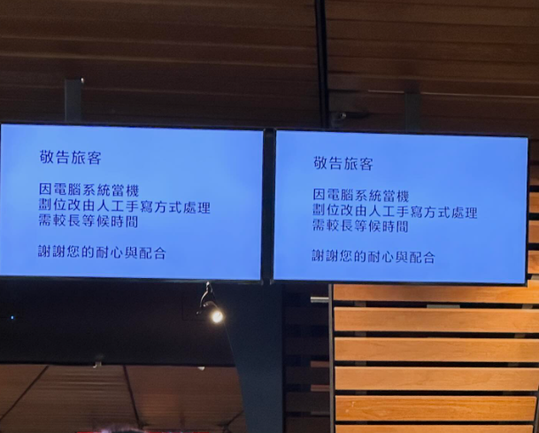 桃園機場公司表示,狀況發生時第一、第二航廈櫃檯報到系統、CUSS自助報到設備(含A1及A3)及登機門系統均已改採人工作業。自助行李託運(SBD)目前如常,部分航空公司請旅客使用手機網路報到後,使用SBD託運行李。經SITA公司修復故障設備後,目前櫃檯報到系統連線恢復正常。