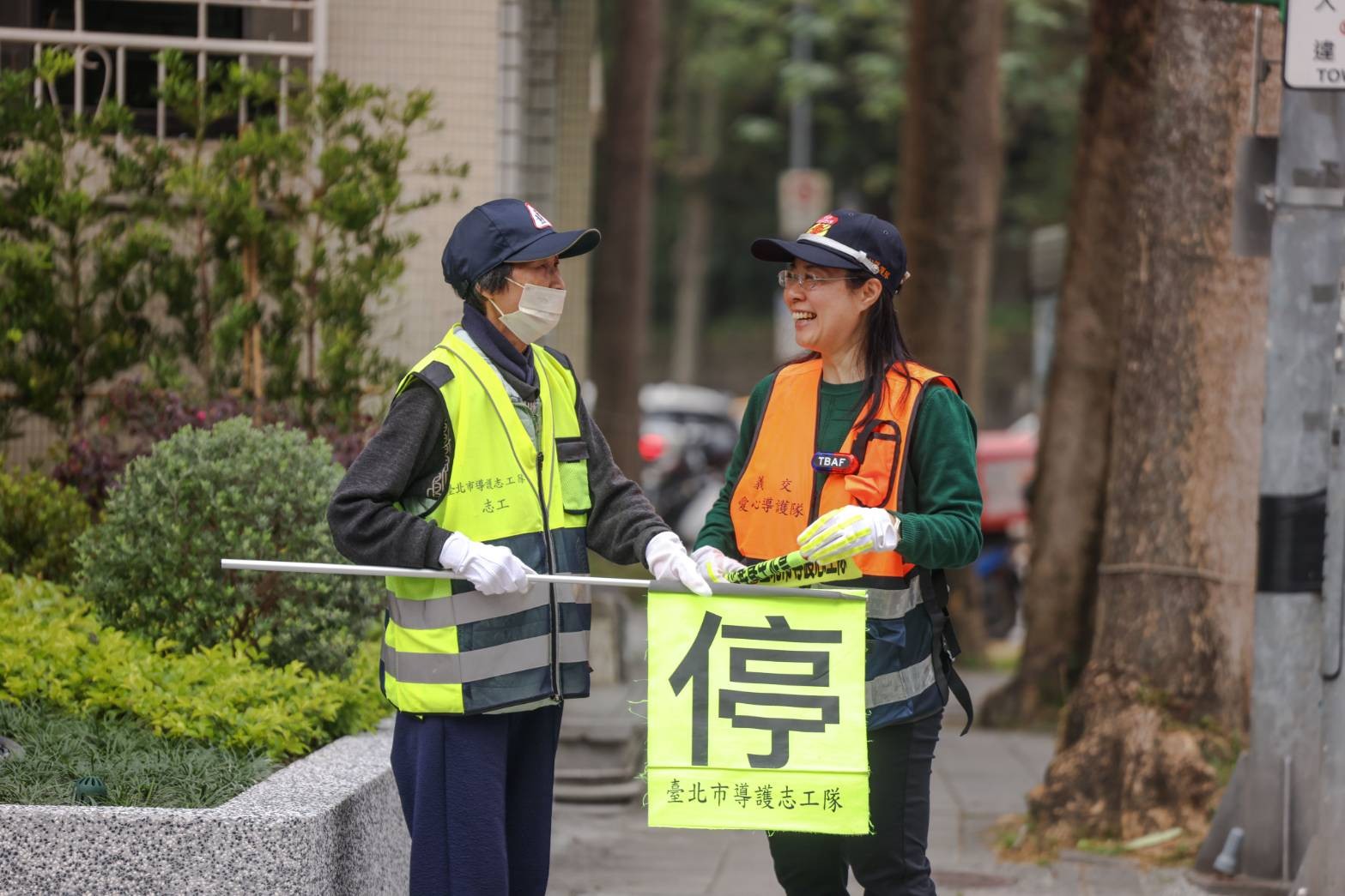 楊琇媛(右)非常敬佩資深的導護志工。李政龍攝