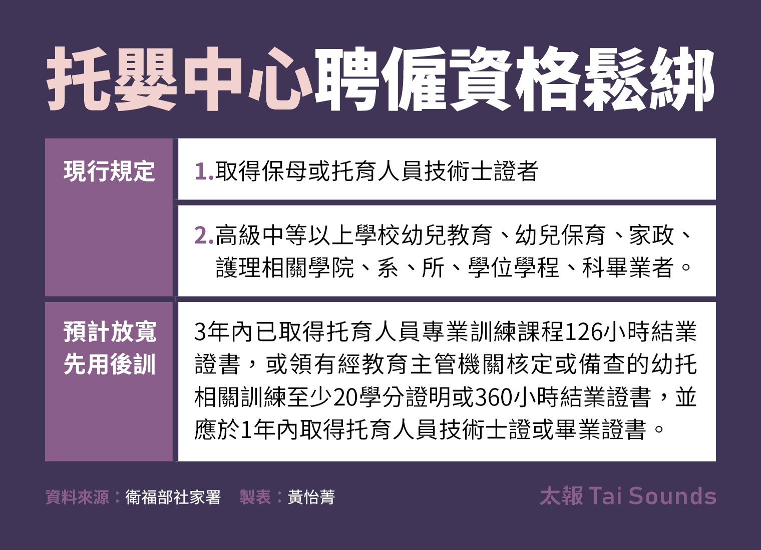 衛福部社家署代理署長周道君解釋,現行規範是幼托人員須取得保母或托育人員技術士證,不然就是高中職、大專院校就讀幼教、幼保、家政、護理相關科系畢業;未來放寬「先用後訓」完成126小時保母職前訓練課,但還來不及通過檢定的人,可以先上工,讓托嬰中心有機會提早延攬人力。