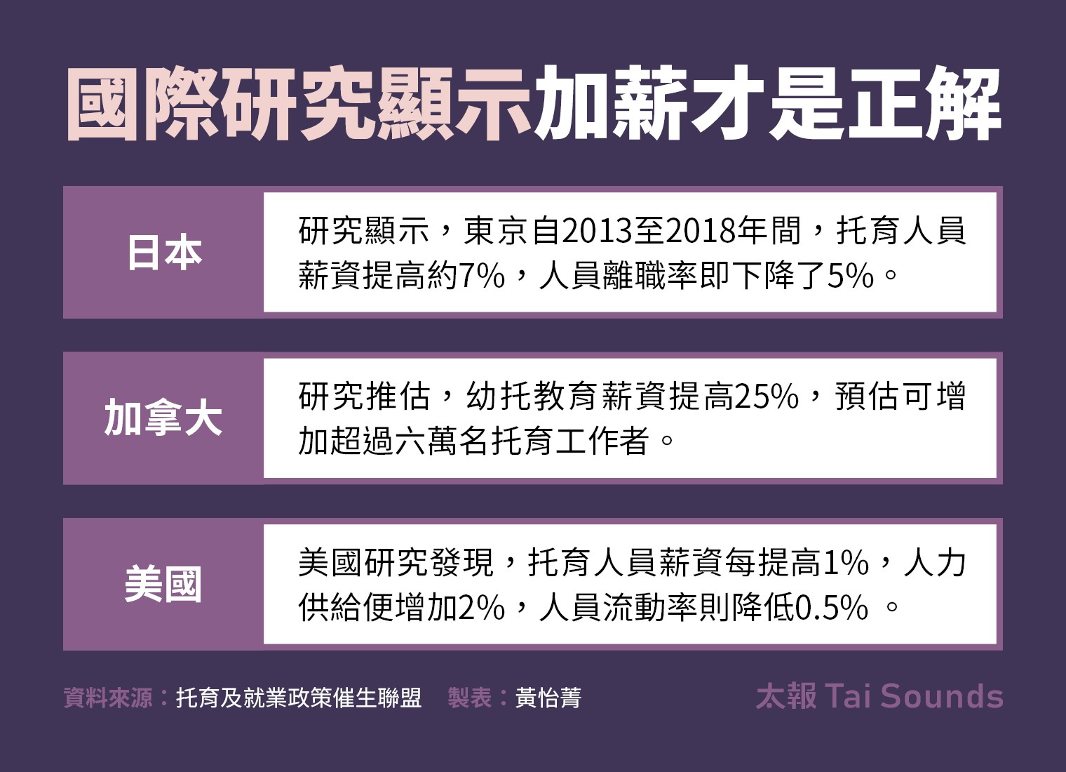全台托嬰中心總共有1,844間,公設民營加上社區公托不到3成,其餘1,331間都是私立托嬰中心。李庭欣認為,公托不足、私托嚴重營利化且壓低薪資,才是缺工的癥結。李庭欣以外國研究為借鏡,主張加薪、改善勞動條件才能留住人力,像日本研究顯示,東京在2013年到2018年間,提高托育人員薪資約7%,離職率也就下降了5%。美國研究則發現,每提高1%薪資,人力供給便增加2%,人員流動率則降低0.5%。