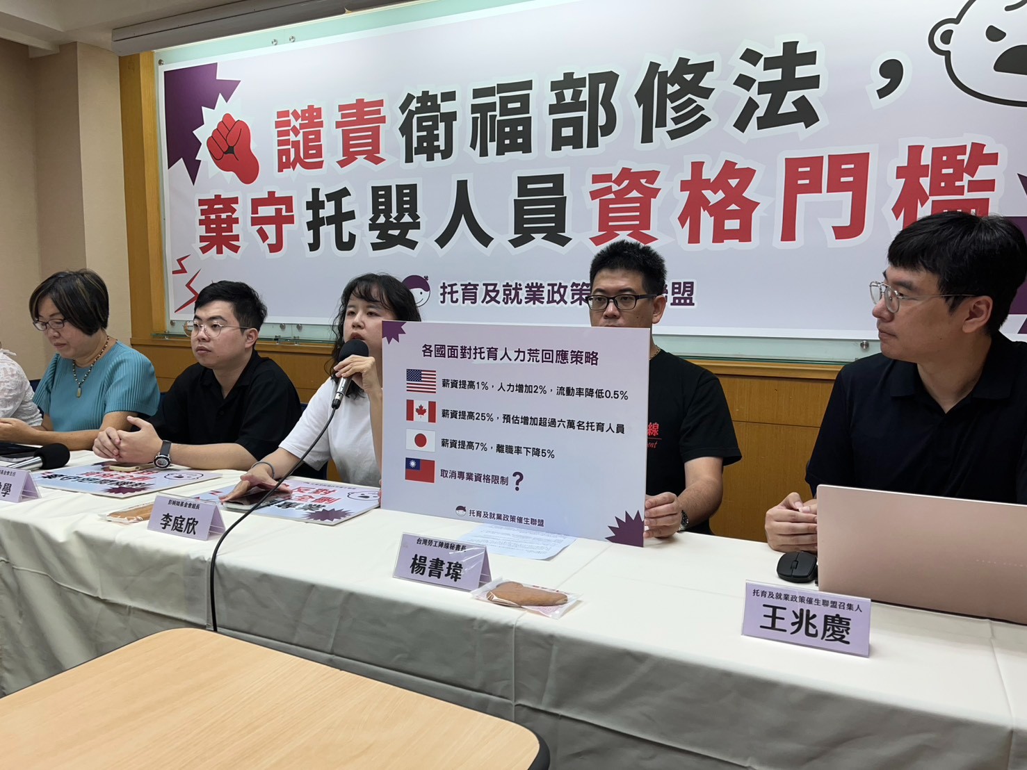 托育員考照不缺人 缺的是改善薪資、勞動條件「政府根本開錯藥方!」李庭欣指出,根據勞動部勞動力發展署統計,台灣每年皆有近6800人成功考取托育人員證照,人力短缺的根本原因,是有資格者缺乏就業意願,或流動率高不願久任。托盟成員、彭婉如文教基金會組長李庭欣(左三)引述他國研究,認為加薪才能有效降低幼托人員流動率。黃怡菁攝