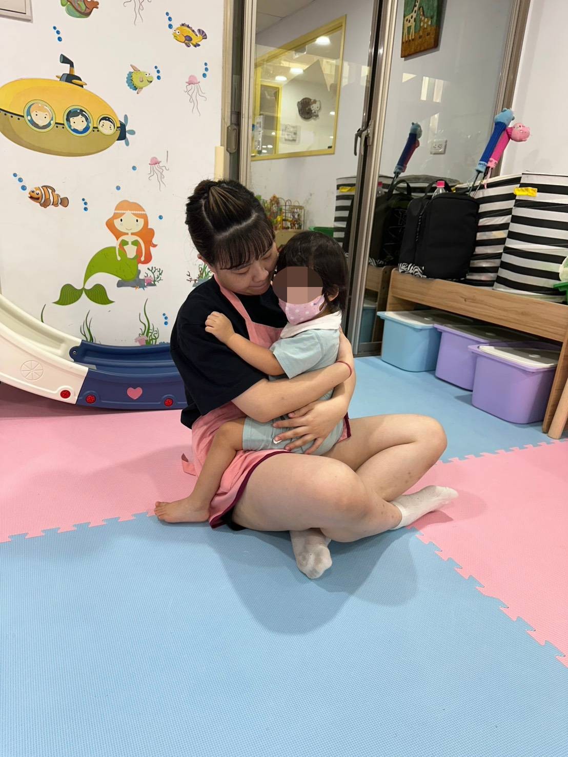 托嬰中心幼托員需長時間蹲坐、彎腰、抱嬰兒。小育龍托嬰中心提供