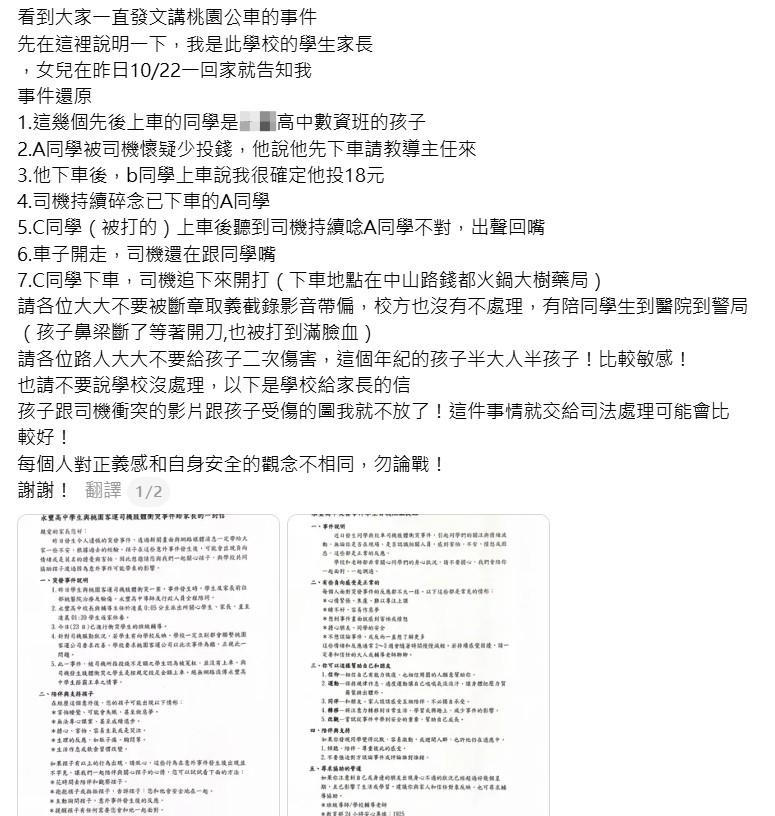 桃園市一名客運司機疑不滿遭高中生乘客嗆聲,竟出手把學生打到鼻樑斷裂、滿臉是血,引發網友譁然。事發影片在網路上瘋傳,不少人根據影片批評學生行為不當等。對此,一名同車學生家長23日在Threads發文,公開7點還原事發經過,澄清孩子並非「搭霸王車」,呼籲外界勿再以偏概全,造成二次傷害。