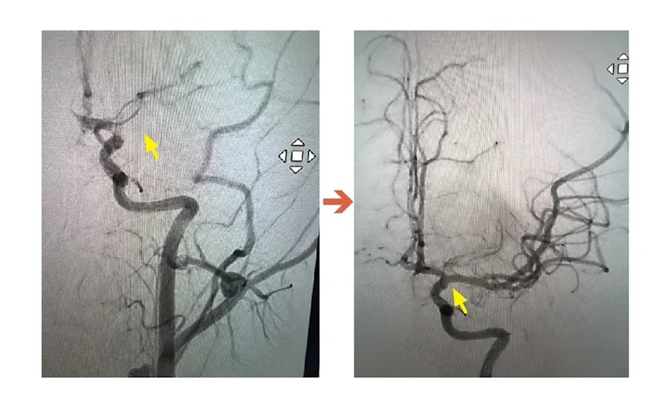從ICA血管攝影可見,圖左箭頭處為血栓阻塞血管,圖右箭頭處則是已打通的血管。聯新國際醫院提供