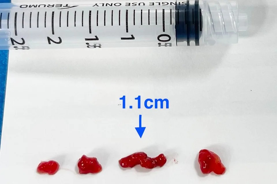該名少年經檢查後,確定為左側中大腦動脈栓塞造成缺血性腦中風,左心房還有近7公分的巨大黏液瘤,隨即進行手術取出,4塊血栓中最大達1.1公分。聯新國際醫院提供