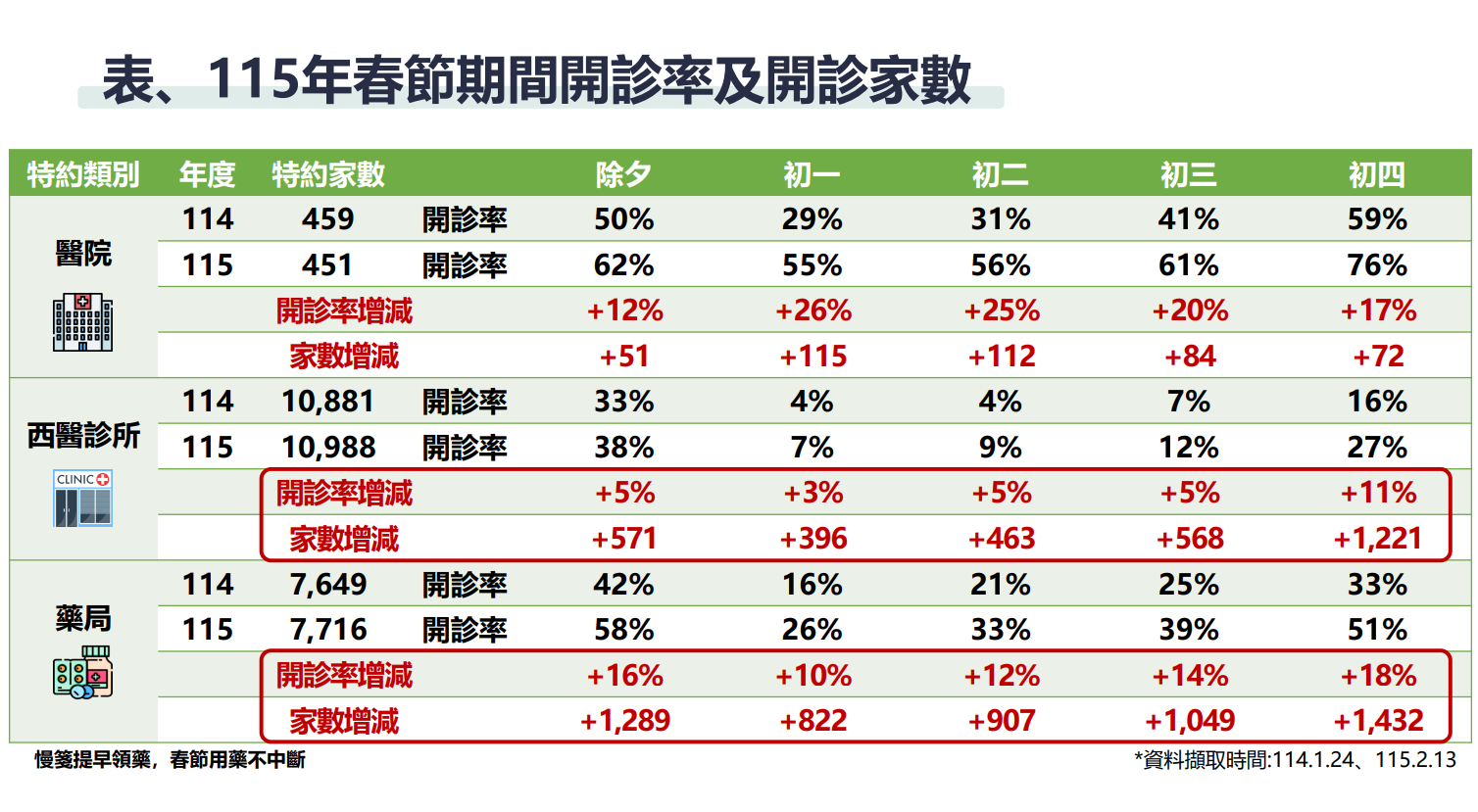 統計顯示,今年共有451家特約醫院參與服務,除夕至初四的開診率分別達62%、55%、56%、61%及76%,相較去年同期分別提升12%至26%,各日開診醫院家數增加51至115家不等。基層醫療方面,今年共有1萬988家特約西醫診所,除夕至初四開診率分別為38%、7%、9%、12%及27%,較去年同期提升3%至11%,開診家數增加396至1221家。社區藥局部分,今年7716家特約藥局中,除夕至初四開診率為58%、26%、33%、39%及51%,也較去年同期提升10%至18%。