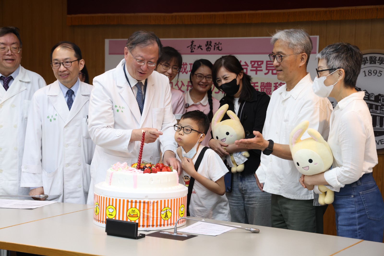 台大醫院「台大醫院成功完成全台罕見兒童一年內『父母接力』肝腎活體移植 跨科整合醫療展現重症兒童治療新里程碑」記者會,台大醫院院長余忠仁(左二)等陪同肝腎移植的許小朋友吹生日蠟燭,右二為腎臟移植宋先生。廖瑞祥攝