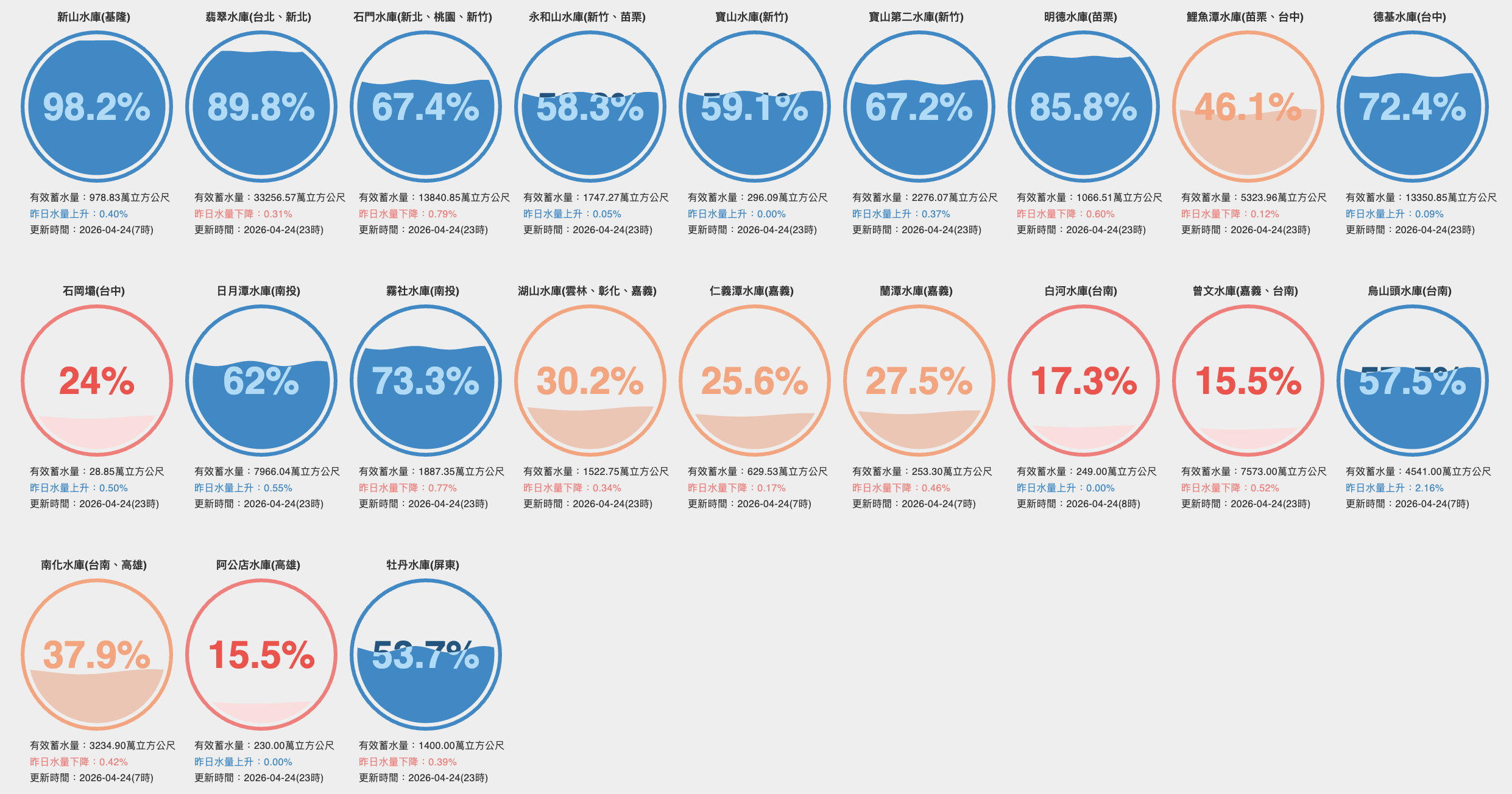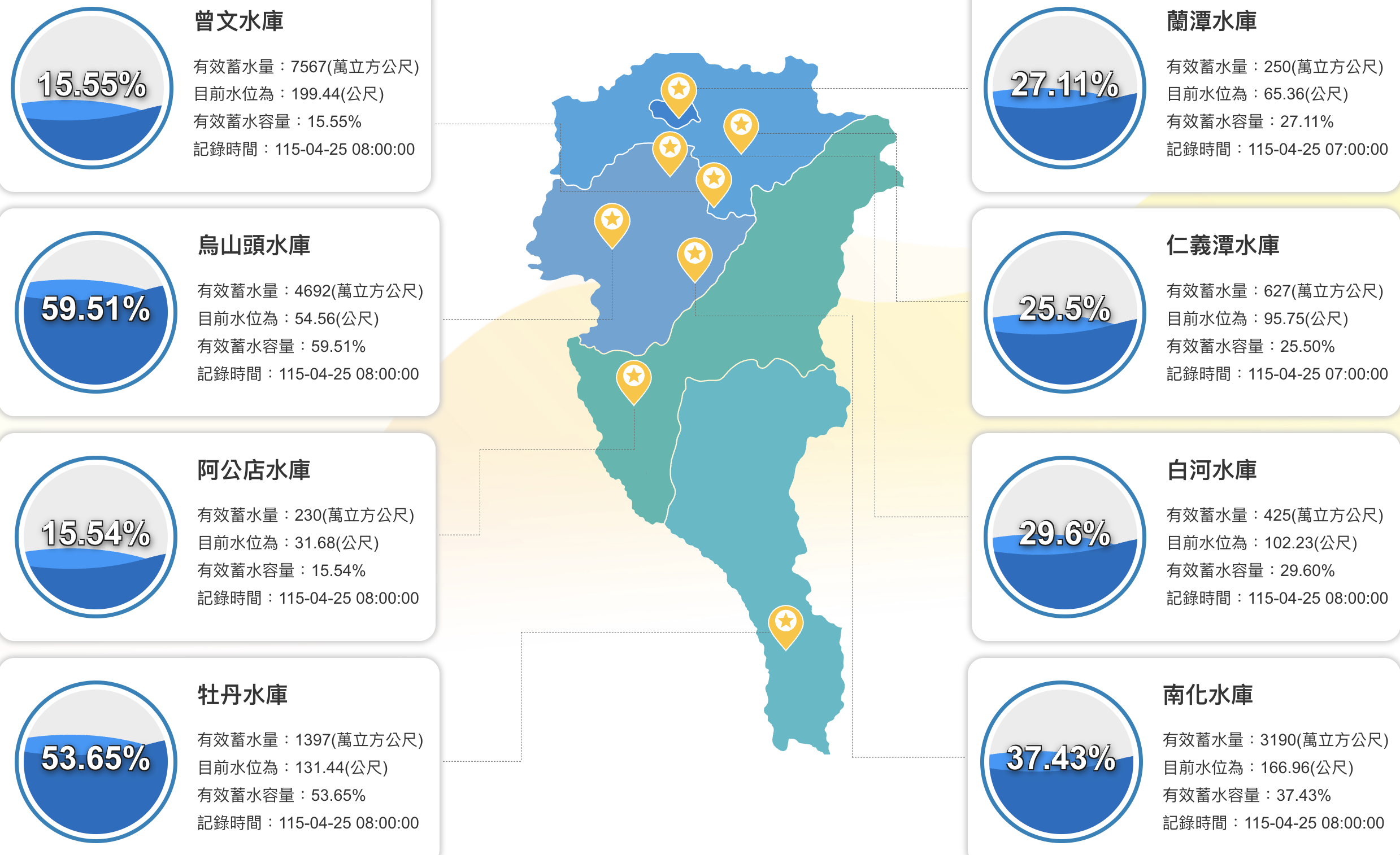 根據「台灣水庫即時水情」網站顯示,截至今天(4/25),石岡壩24%、湖山水庫30.2%、仁義潭水庫25.6%、蘭潭水庫27.5%、白河水庫17.3%、曾文水庫15.5%、南化水庫37.9%、阿公店水庫15.5%。