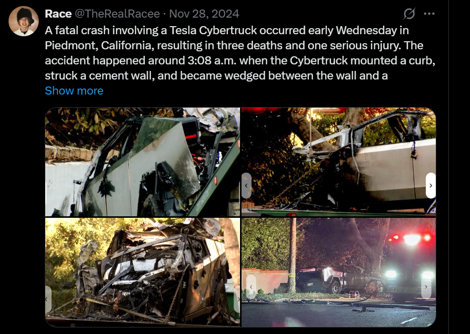 事故發生在2024年11月27日凌晨3點多,20歲尼爾森(Jack Nelson)與朋友出遊,Cybertruck車上包含他共有四人,行進間撞上路樹起火,車上三人遭燒死。