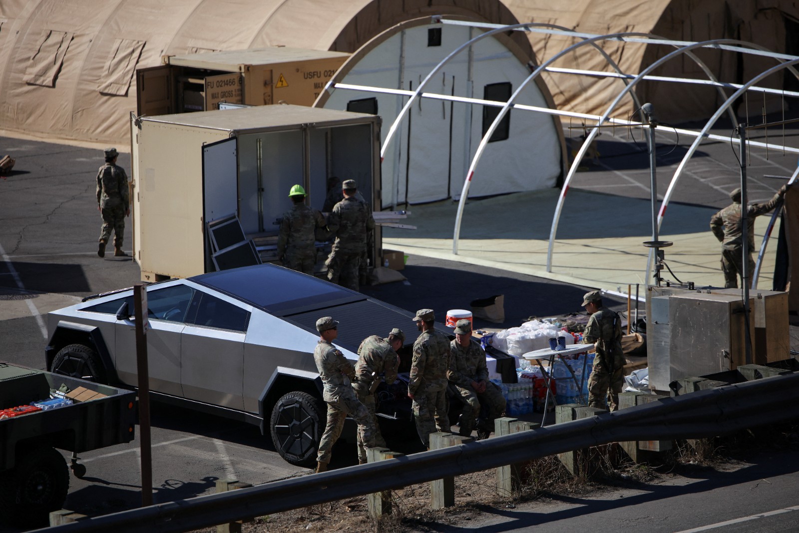 照片是參與加州野火救援工作的美國國民兵,在洛杉磯西郊整理裝備,包括馬斯克捐贈的電動車Cybertruck。資料照。路透社