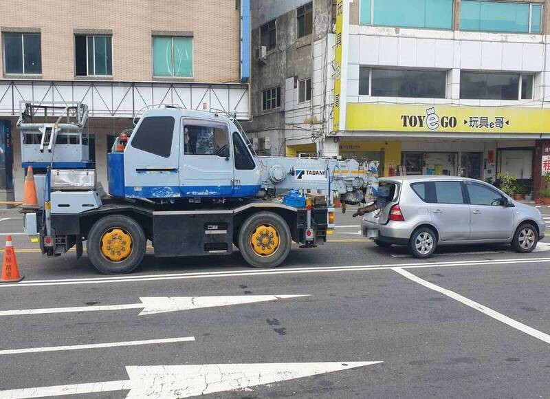 大吊車吊臂撞進小客車後座,嚇壞路人及駕駛。讀者提供
