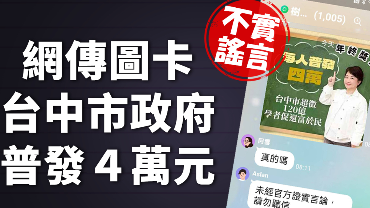 民眾轉貼「台中市政府普發4萬元」圖卡,被依《社維法》移送,台中市政府呼籲民眾不要轉傳。台中市政府提供