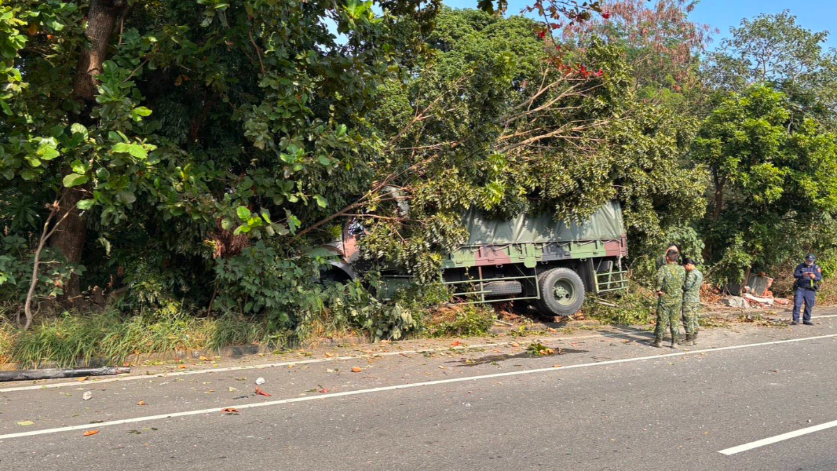 台南市山上區台20線19.2公里處今(11/25)上午9時許發生事故,一輛自官田營區出發、載運床墊準備前往新化區台南聯保廠的軍用卡車,行經西向下坡彎道時疑似因駕駛恍神,突然往右失控衝出車道,猛烈撞上路樹與護欄後才停下,險些翻落山坡。