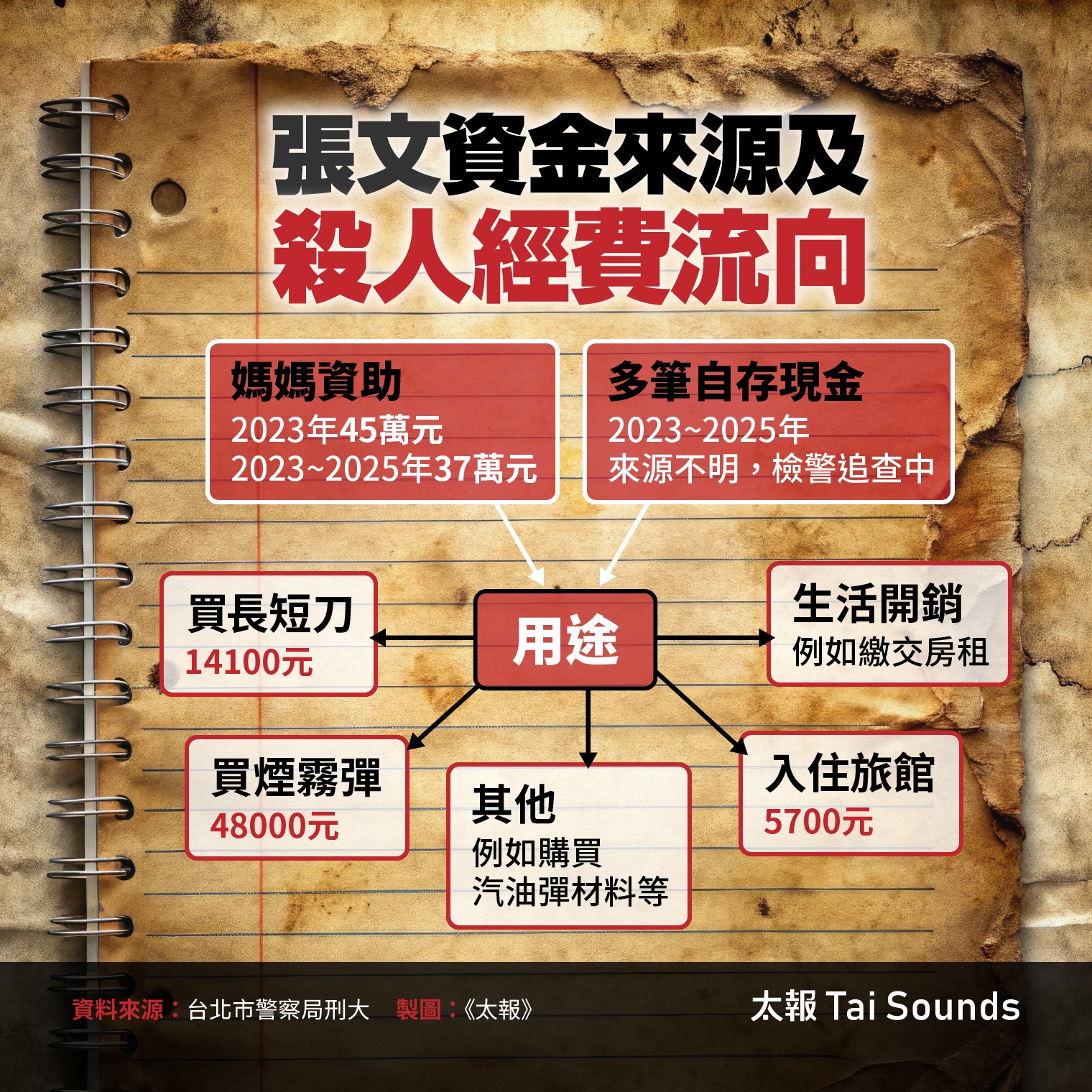 通緝犯張文涉嫌在北捷殘殺3人,台北市警察局專案小組發現張文早在2023年8月就失業,除了當保全時的存款,以及媽媽金援,20日最新案情進展,警方查到張文的金融帳戶近兩年有多筆自存現金,現金來源不明,檢警全力追查沒工作的他,這些現金從哪裡來的?《太報》透過一張繪製圖表,盤整張文資金來源和流向,讓讀者輕鬆掌握全貌