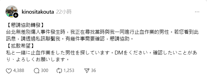 木下在threads以中、日文發文,「台北無差別傷人事件發生時,我正在尋找當時與我一同進行止血作業的男性。若您看到此訊息,請透過私訊聯繫我。有幾件事需要確認,懇請協助。」