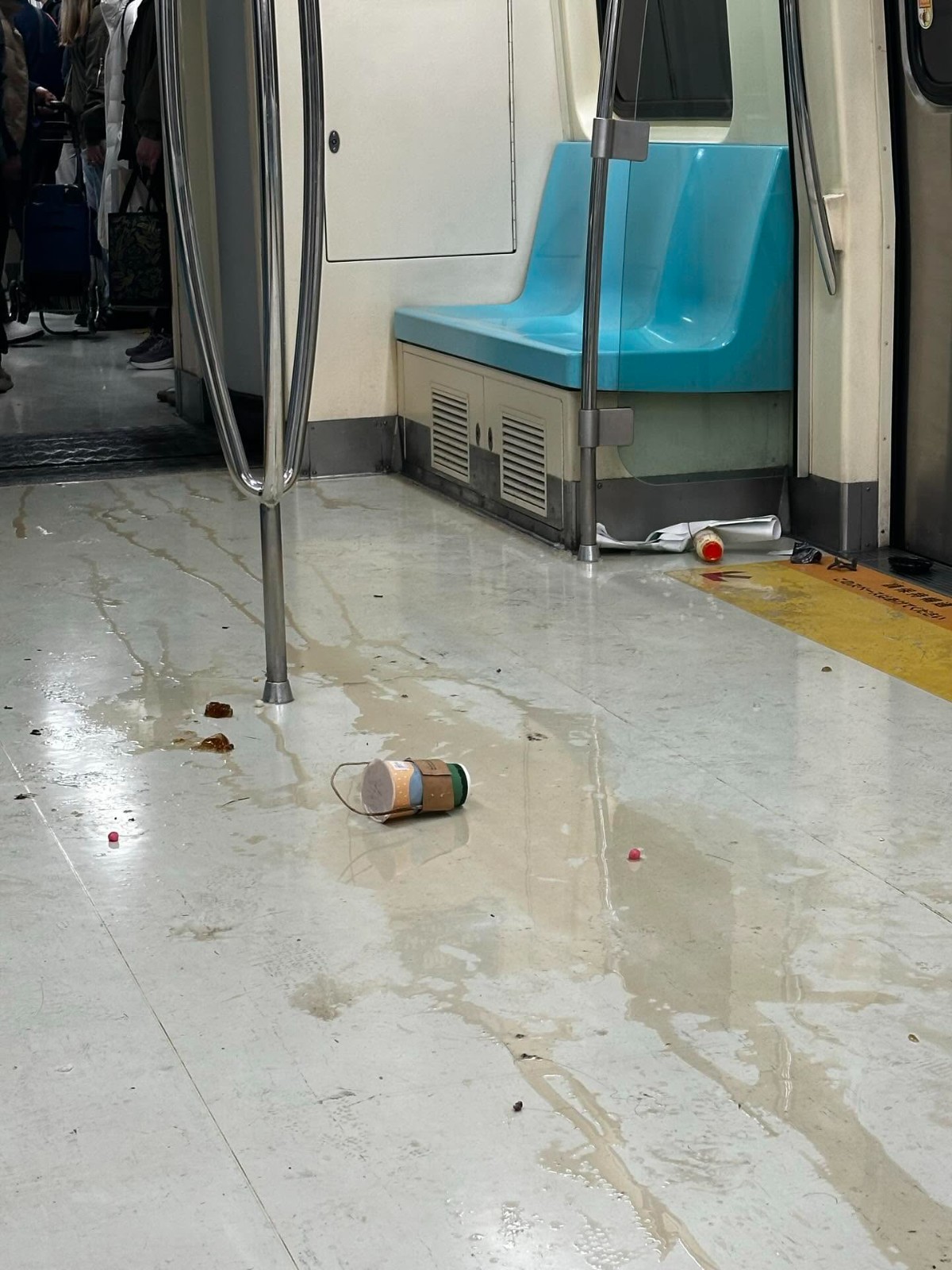 北捷發生男子失控事件,乘客當場驚嚇逃離,急忙中在車廂留下飲料等物。threads@chi_shang1119授權提供